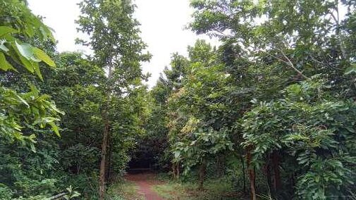 An abandoned cashew plantation taken over by illegal laterite stone mining had caused the area to be exploited with nothing left but large laterite pits, aging and half uprooted cashew trees, and surface vegetation that was regularly used by locals for grazing their cows and goats, or for firewood. Where mining had not been done, old cashew trees bore fruit during April-May and the nut collection process was leased out by the previous owner. The cashew apple fruits were consumed by local kids and mostly by animals from the village and the nearby forest.